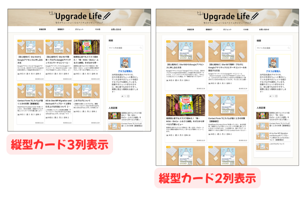 その場合は、記事をカード状に表示したり、表示数を調整したりして、エントリーの表示形式を変更してみましょう。