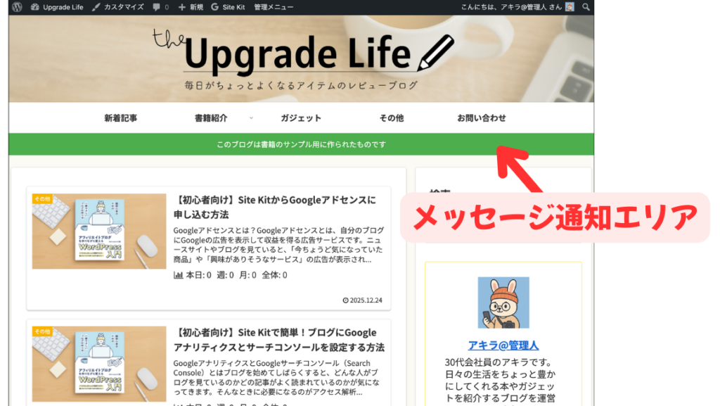ヘッダー下に通知メッセージを表示する機能があります。